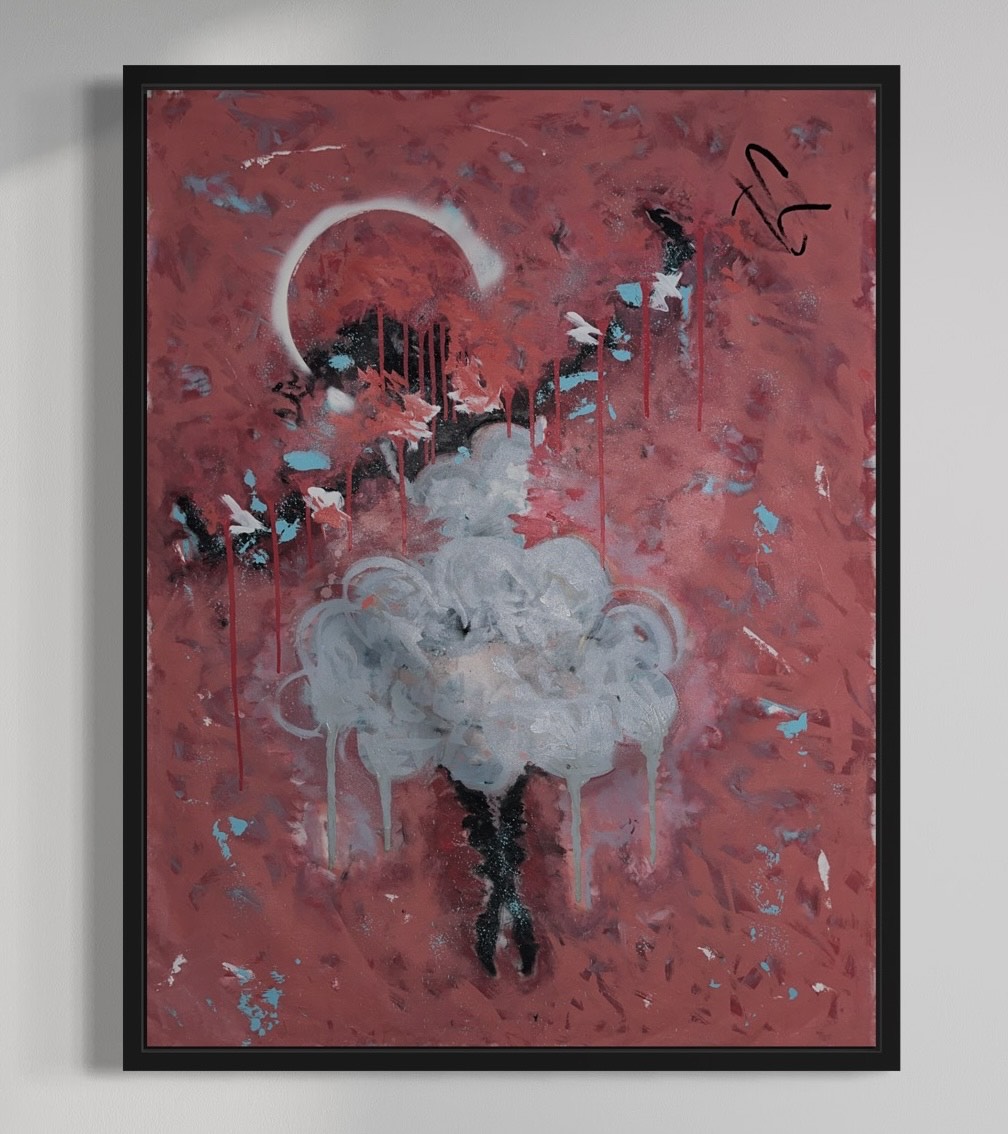 A: Over time, I’ve become more confident in my skills, more willing to experiment, and better at recognizing when a piece is complete. My work has shifted from being chaotic and color-heavy to more refined, calm, and balanced, using more negative space. I’ve also expanded the mediums I work with, adding oil, charcoal, spray paint, and other materials to my original acrylic-on-canvas practice.
